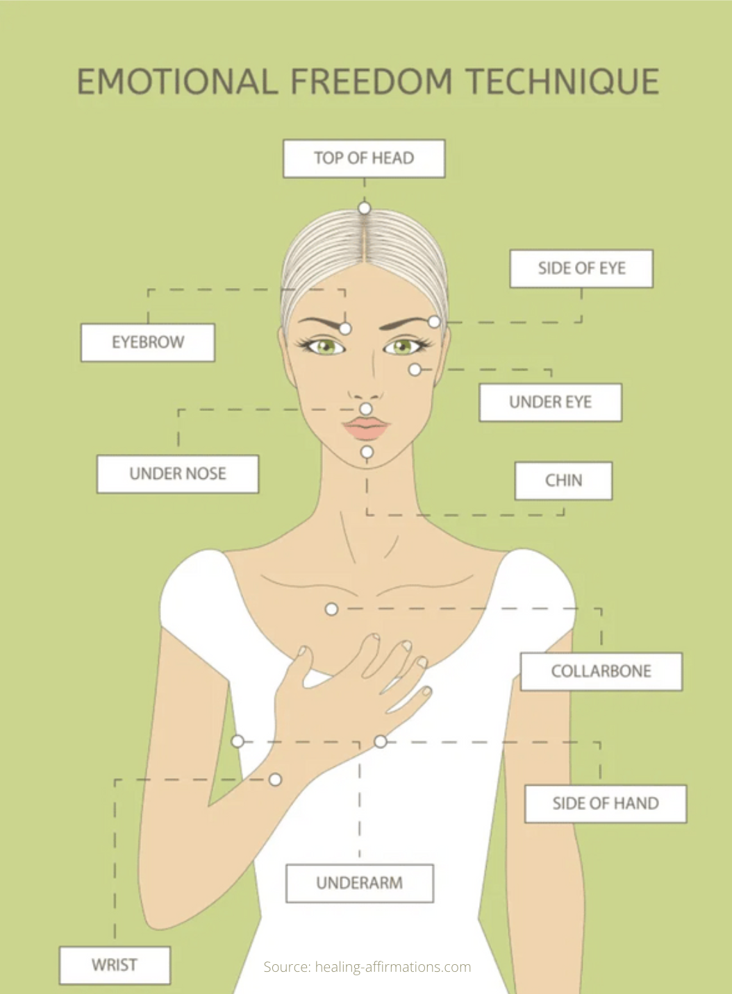 Il s’agit de tapoter (cf méthode dite du tapping) certains points d’acupuncture, du bout des doigts. Tapoter ces points d’entrée et de sortie de méridiens en évoquant par la parole ce qui vous gêne, permet de vous libérer de vos émotions négatives, bloquantes, et que l’énergie circule à nouveau de façon fluide à travers vos méridiens énergétiques.